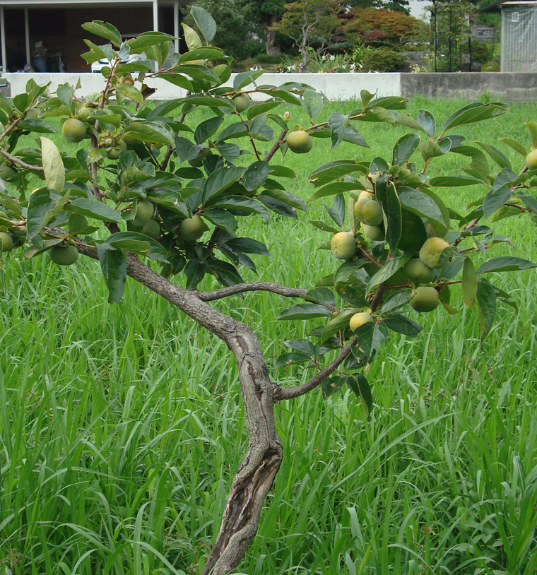 今年も遊休地の柿が青い実をつけています。無農薬で雑草とともに育つ、奇跡の渋柿です。